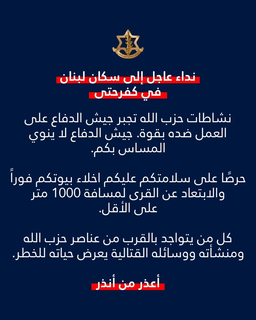 “انذارعاجل إلى سكان لبنان في كفرحتى