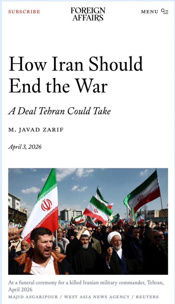 منذ الثامن والعشرين من فبراير، والإيرانيون يهتفون كل ليلة: “لا استسلام، لا مساومة، سنحارب أمريكا” يقول ظريف عن سلوك القاعدة المؤيدة للنظام، ثم يقضي مقاله بالكامل في محاولة إقناعهم بقبول ما يتظاهرون ضده.