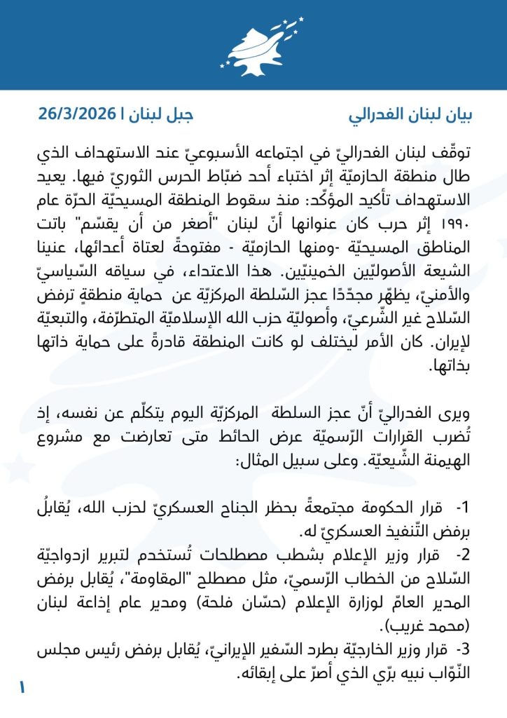 جاء في بيان لبنان الفدرالي: