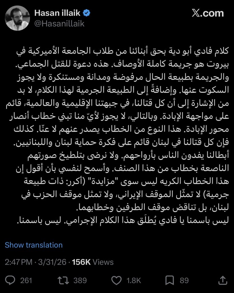 “كلام فادي أبو دية بحق أبنائنا من طلاب الجامعة الأميركية في بيروت هو جريمة كاملة الأوصاف. هذه دعوة للقتل الجماعي. والجريمة بطبيعة الحال مرفوضة ومدانة ومستنكرة ولا يجوز السكوت عنها. وإضافةً إلى الطبيعة الجرمية لهذا الكلام، لا بد من الإشارة إلى أن كل قتالنا، في جبهتنا الإقليمية والعالمية، قائم على مواجهة الإبادة. وبالتالي، لا يجوز لأيّ منا تبني خطاب أنصار محور الإبادة. هذا النوع من الخطاب يصدر عنهم لا عنّا. كذلك فإن كل قتالنا في لبنان قائم على فكرة حماية لبنان واللبنانيين. أبطالنا يفدون الناس بأرواحهم. ولا نرضى بتلطيخ صورتهم الناصعة بخطاب من هذا الصنف. وأسمح لنفسي بأن أقول إن هذا الخطاب الكريه ليس سوى “مزايدة” (أكرر: ذات طبيعة جرمية) لا تمثّل الموقف الإيراني، ولا تمثل موقف الحزب في لبنان، بل تناقض موقف الطرفين وخطابهما.